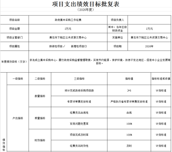 (7)2026年度项目绩效总目标是:按照法定规则和操作程序,努力营造执行快速、管理到位、服务高效、保障有力的公共资源交易服务平台,为各类重大项目提供优质交易服务,实现办公自动化、无纸化,适应社会发展。