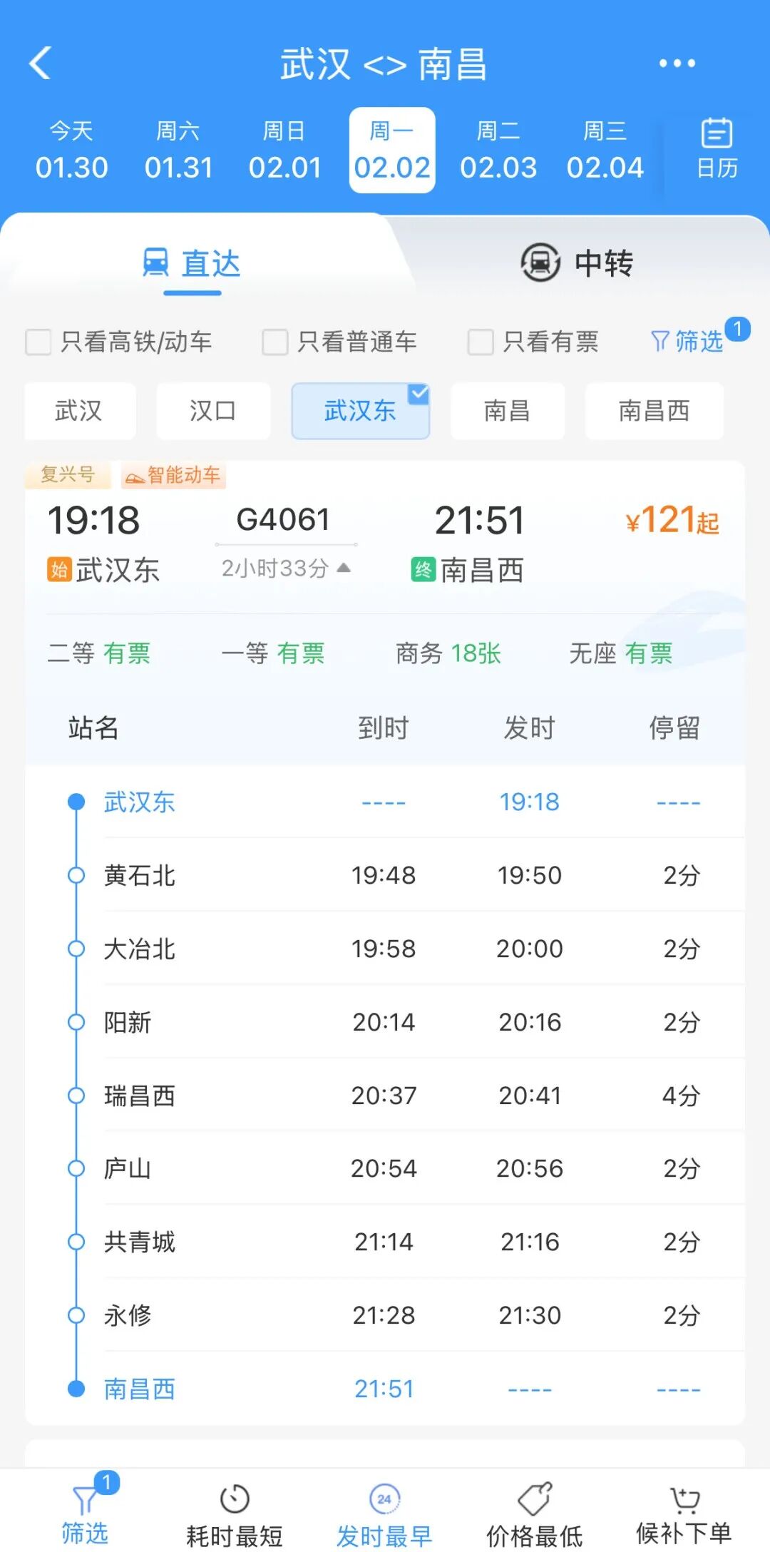 G4061次列车19:18从武汉东站发车,经停黄石北、大冶北、阳新、瑞昌西、庐山等8个站点,21:51抵达南昌西站,全程仅2小时33分钟,实现高效联通;
