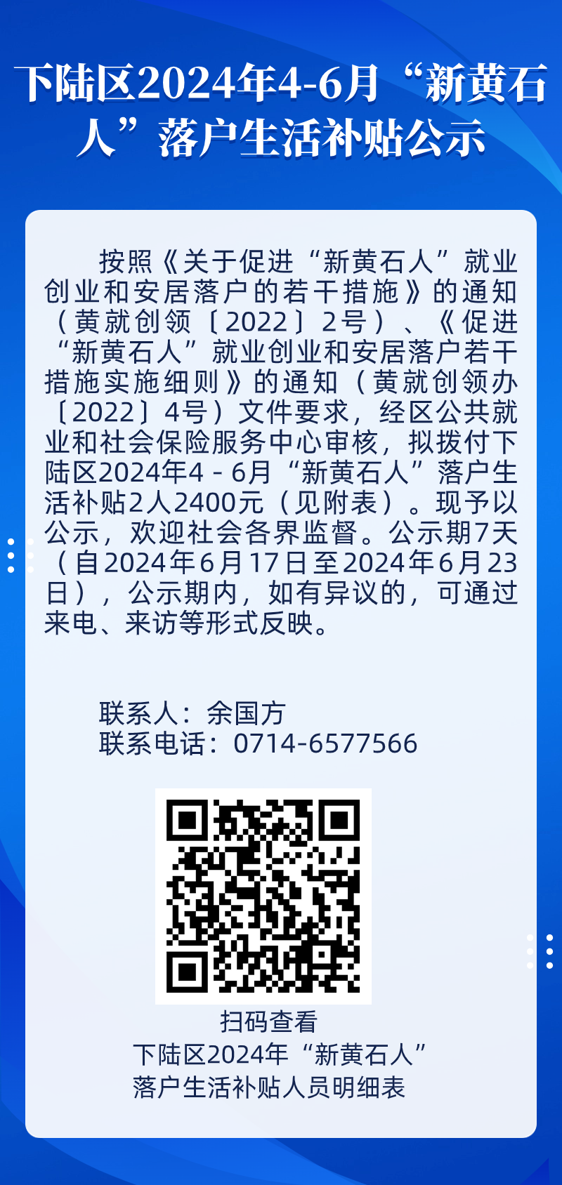名 称: 下陆区2024年4-6月“新黄石人”落户生活补贴公示