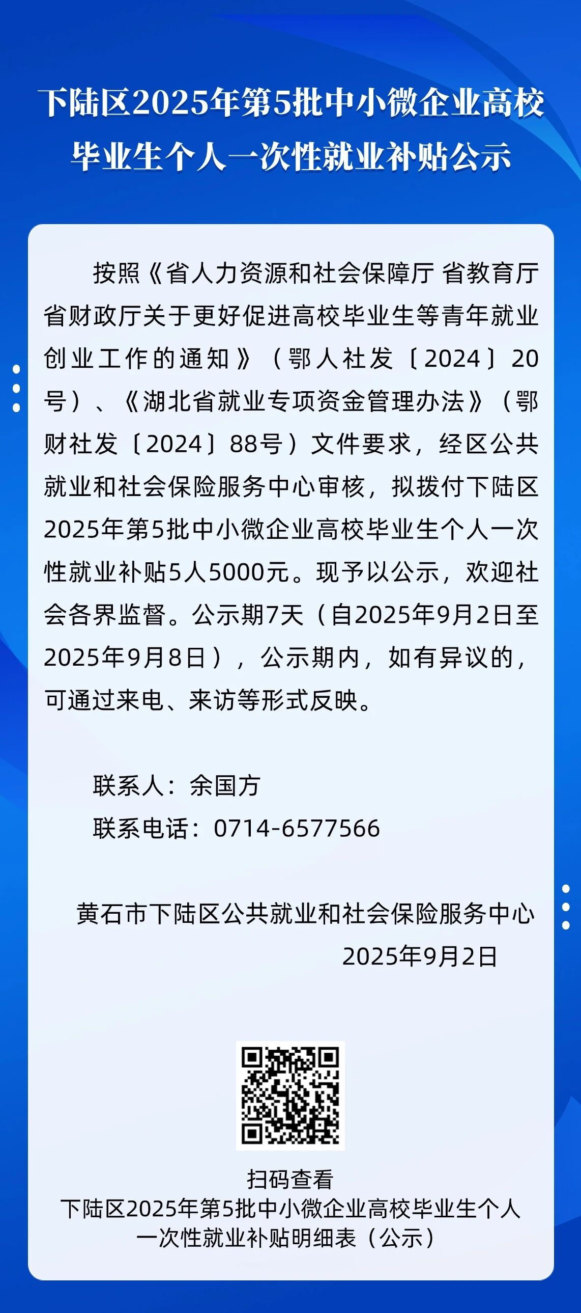 名 称: 下陆区2025年第5批中小微企业高校毕业生个人一次性就业补贴公示