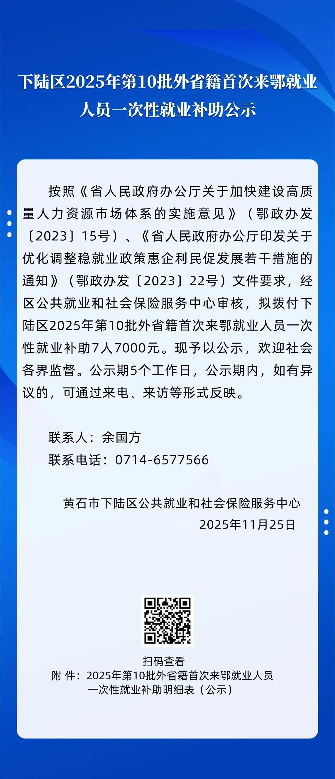 名 称: 下陆区2025年第10批外省籍首次来鄂就业人员一次性就业补助公示