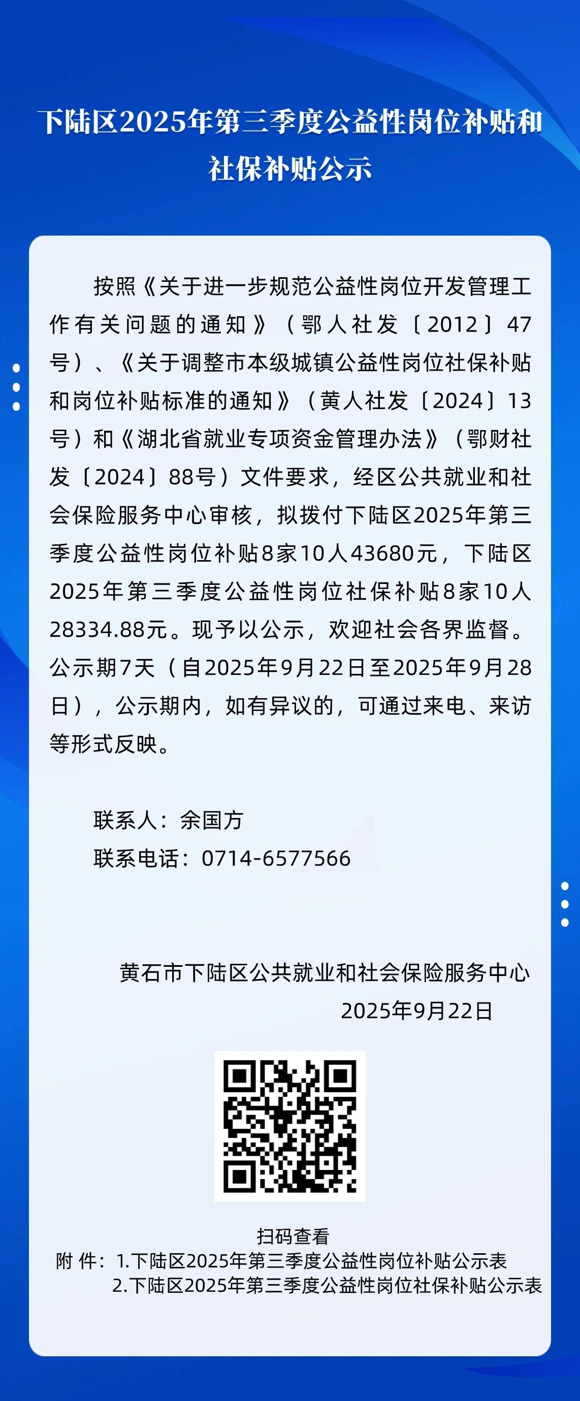 名 称: 下陆区2025年第三季度公益性岗位补贴和社保补贴公示