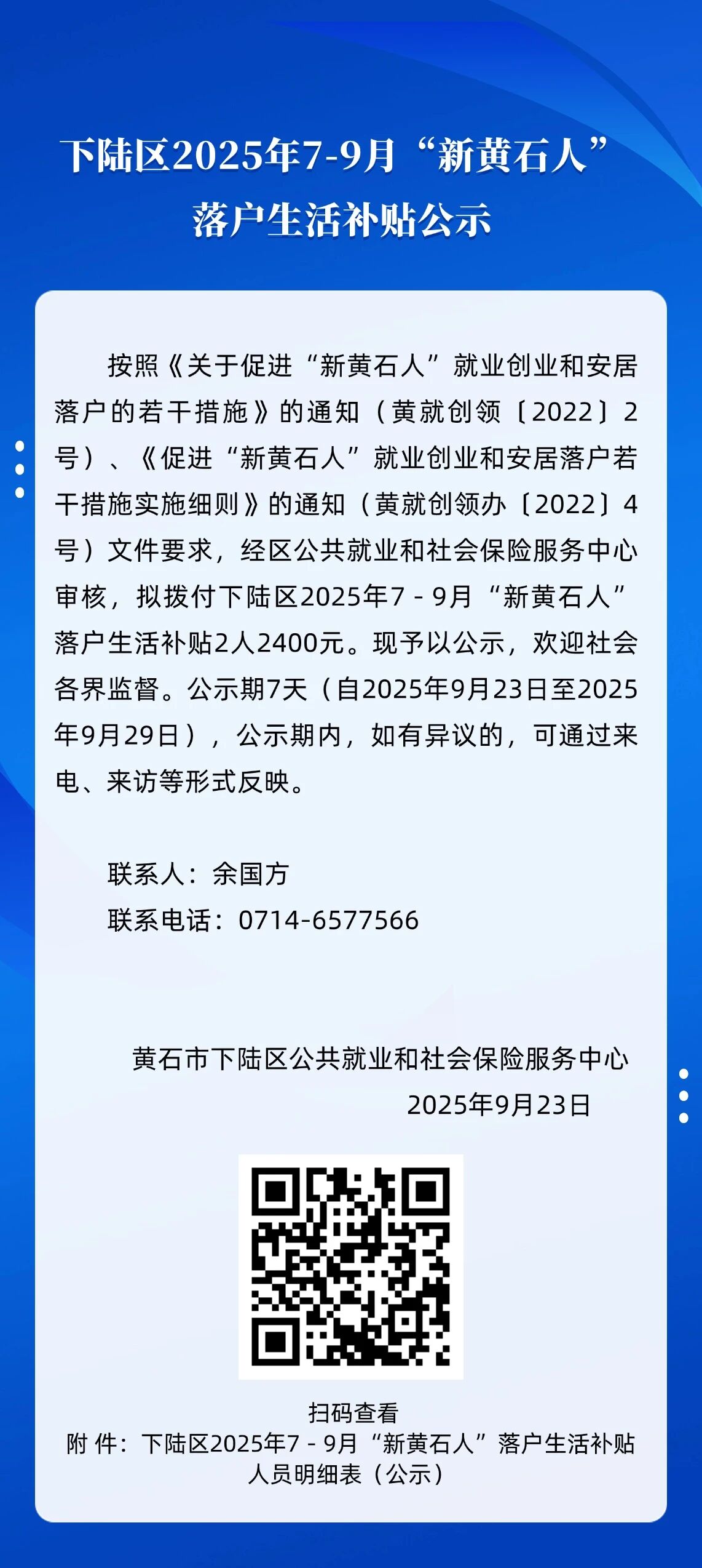 名 称: 下陆区2025年7-9月“新黄石人”落户生活补贴公示