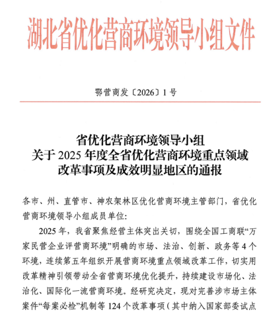 近日,省优化营商环境领导小组印发《关于2025年度全省优化营商环境重点领域改革事项及成效明显地区的通报》,我区3项改革事项成功入选并获全省通报表扬。其中,完善涉市场主体案件“每案必检” 机制、优化纳税申报“健康检”2项为国家部委部署改革事项,聚焦“两创”融合打造“五个一”校地合作新模式为省级改革事项。