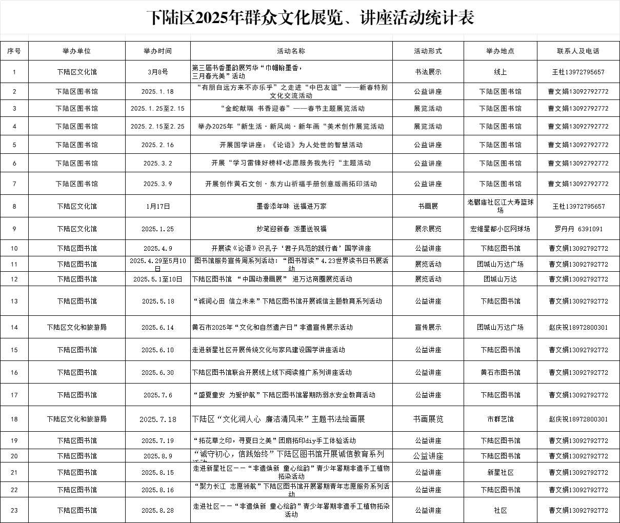 名 称: 下陆区2025年群众文化展览、讲座活动统计表