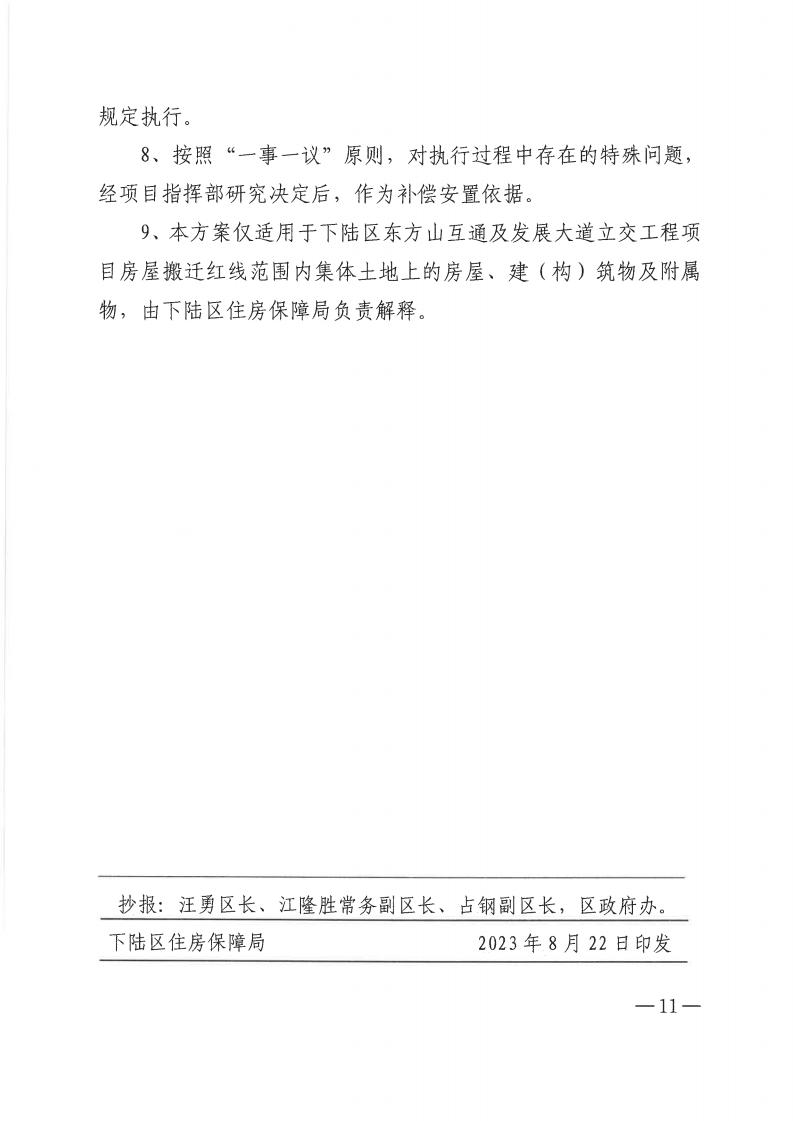 名 称: 关于印发《下陆区东方山互通及发展大道立交工程项目集体土地房屋搬迁补偿安置方案》的通知